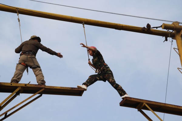 在拓展訓練的過程中,大學生們精神飽滿、積極參與,充分展現(xiàn)了江泉人的風采。伴隨著緊張的集合哨聲,訓練課程正式開始,大學生們穿著整齊統(tǒng)一的訓練服,步伐整齊,喊著響亮的口號,將青春的色彩點綴了整個訓練基地。天氣炎熱,但大學生的激情不減,烈日下進行著緊張的訓練,課程緊湊、要求嚴格,每天的訓練都在整齊洪亮的餐訓聲中結(jié)束,“軍井未掘,將不言渴;軍灶未開,將不言餓;雨不披蓑,雪不穿裘;將士冷暖,永記我心!”